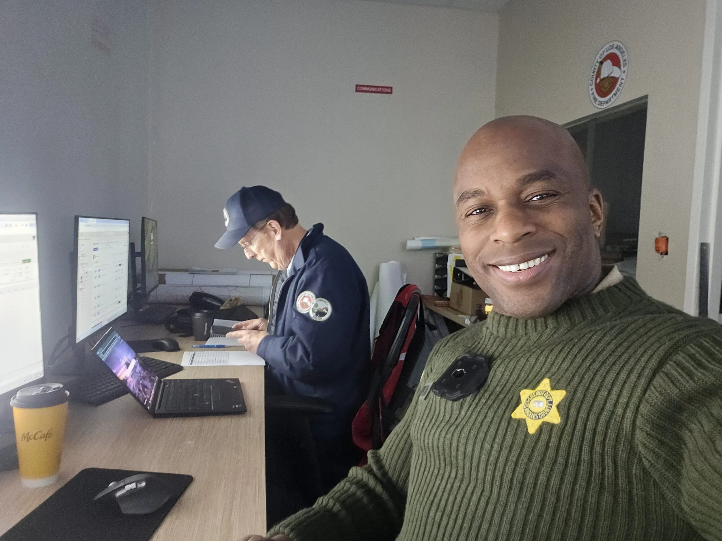 Brent Woodworth, LAEPF CEO & LARCRO Board Chair joins Sheriff Deputy D’Andre Lampkin & LARCRO Vice Chair at the Lost Hills Sheriff Incident Command Center for the 2025 LA Fire response.