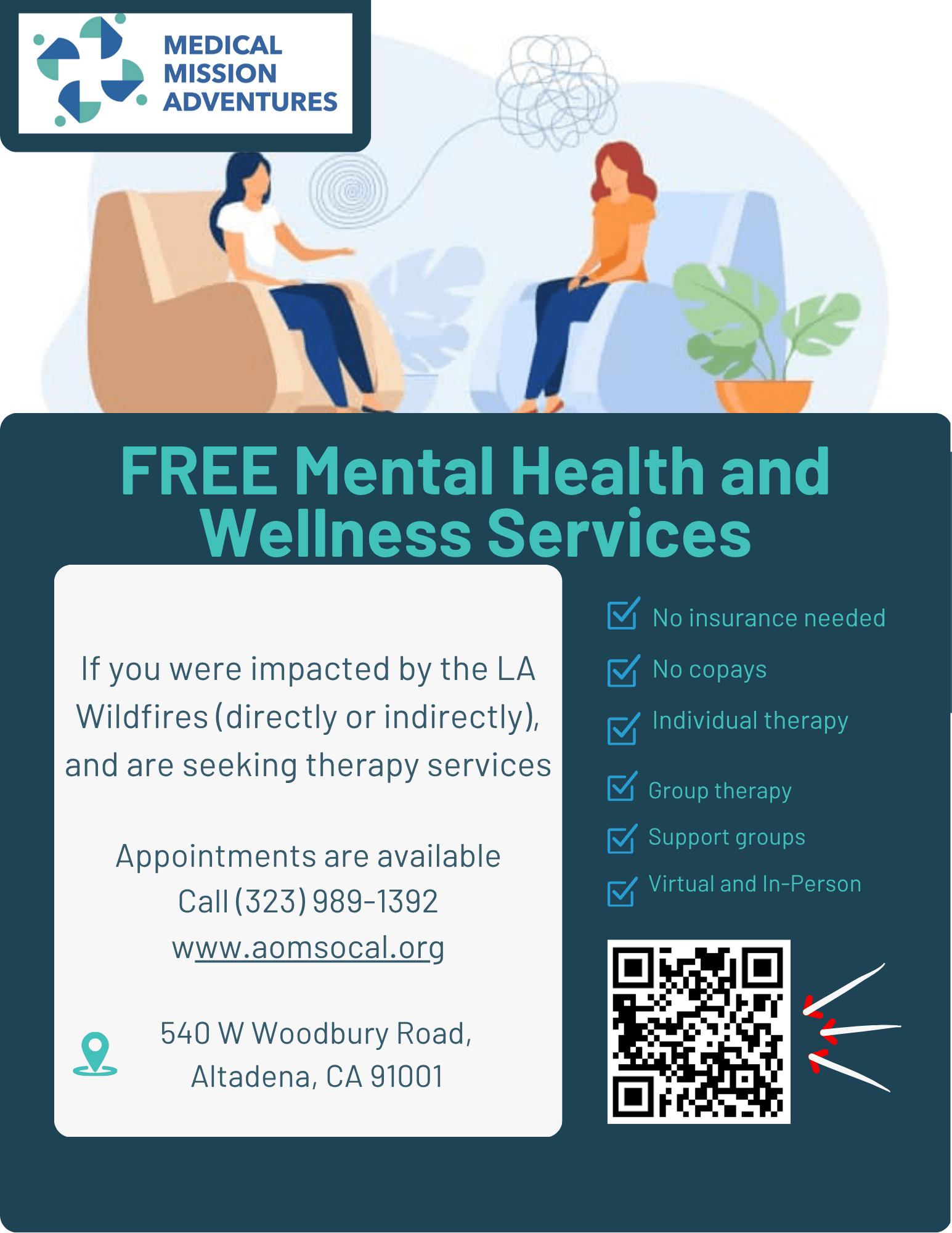 Located in Pasadena, Foothill Flourish will provide 10 therapy sessions at no cost for those who have been directly affected by the Eaton fire,—because your mental well-being matters. Click here to get started.