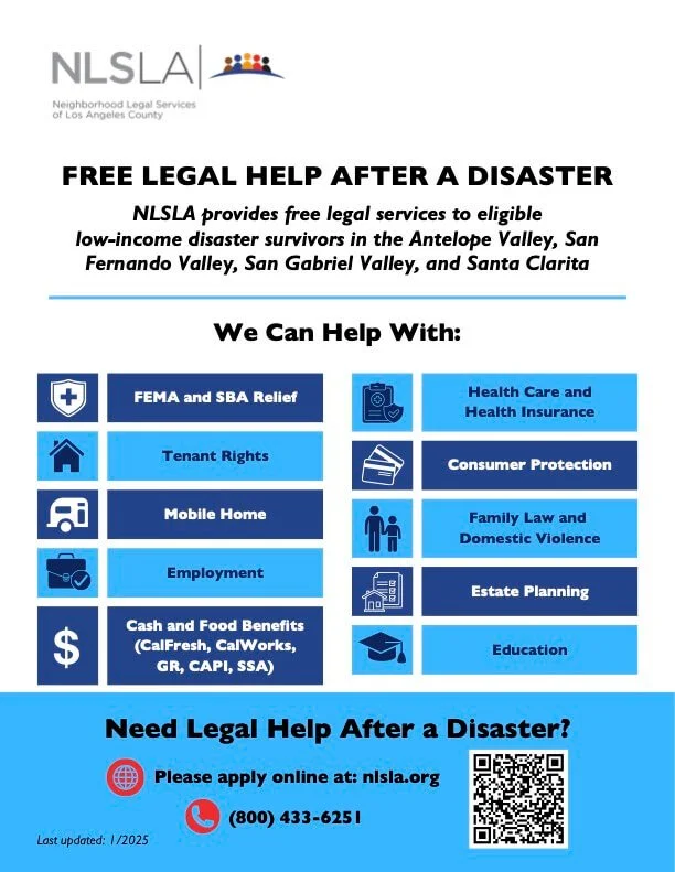 Neighborhood Legal Services Los Angeles provides free legal assistance to low-income and older Los Angeles residents with fire and disaster related issues.