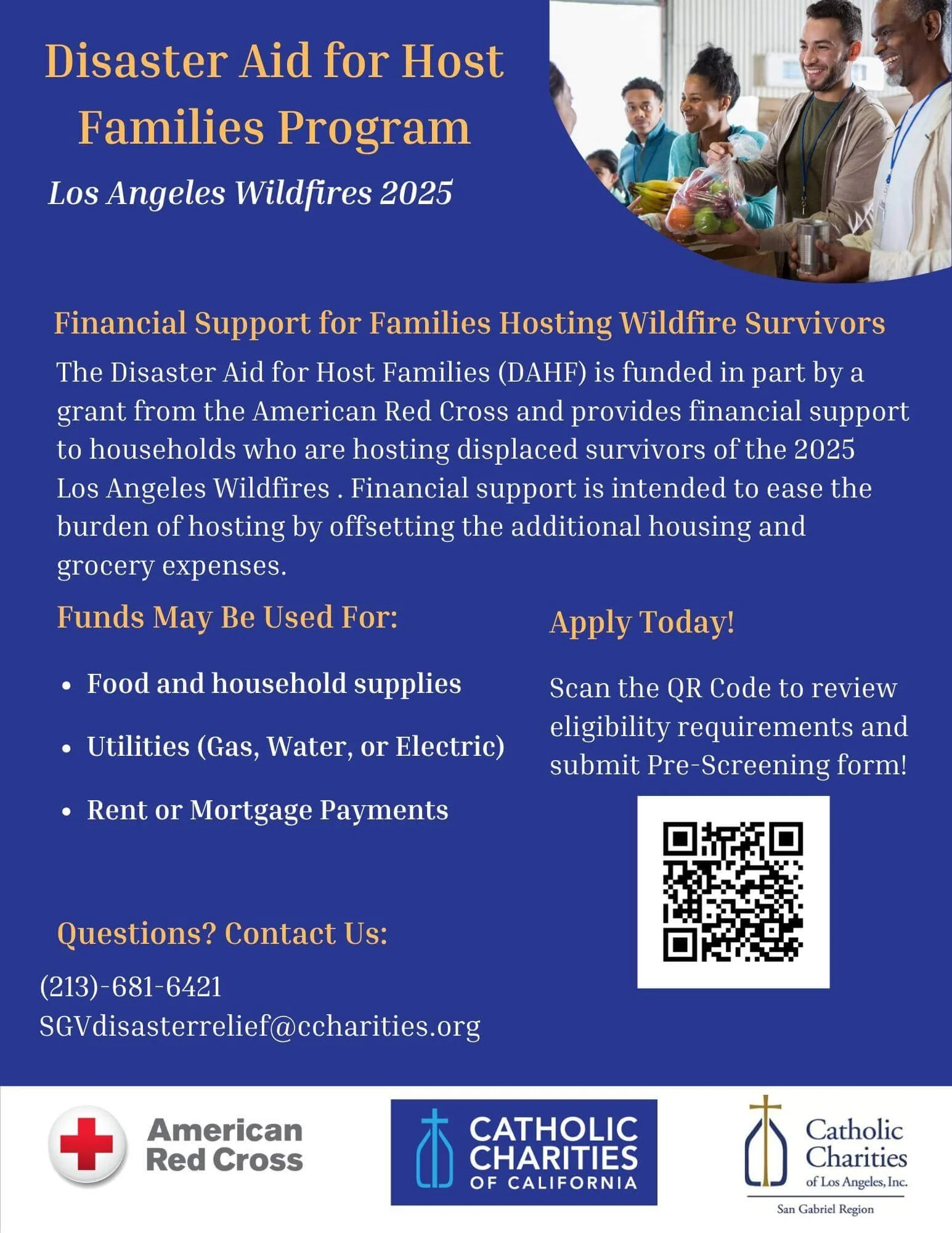 Disaster Aid for Host Families (DAHF) Program is funded in part by a grant from the American Red Cross to Support Households offering housing to individuals and families displaced by the 2025 Los Angeles Wildfires.